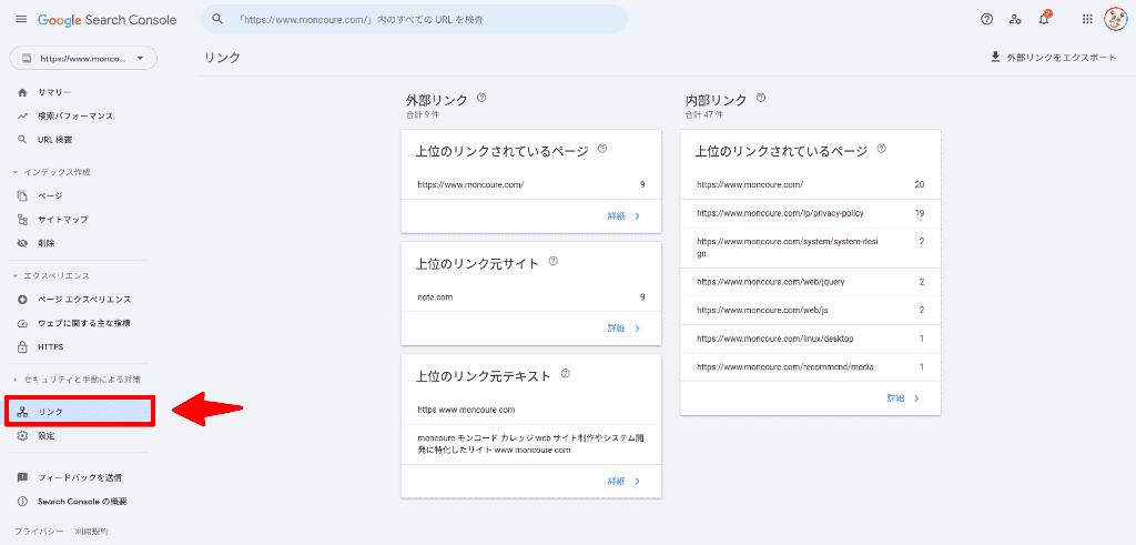 「リンク」メニューをクリックすると自社サイトのどのページにリンクがあるか、リンク元のサイトやページ数を確認できます。