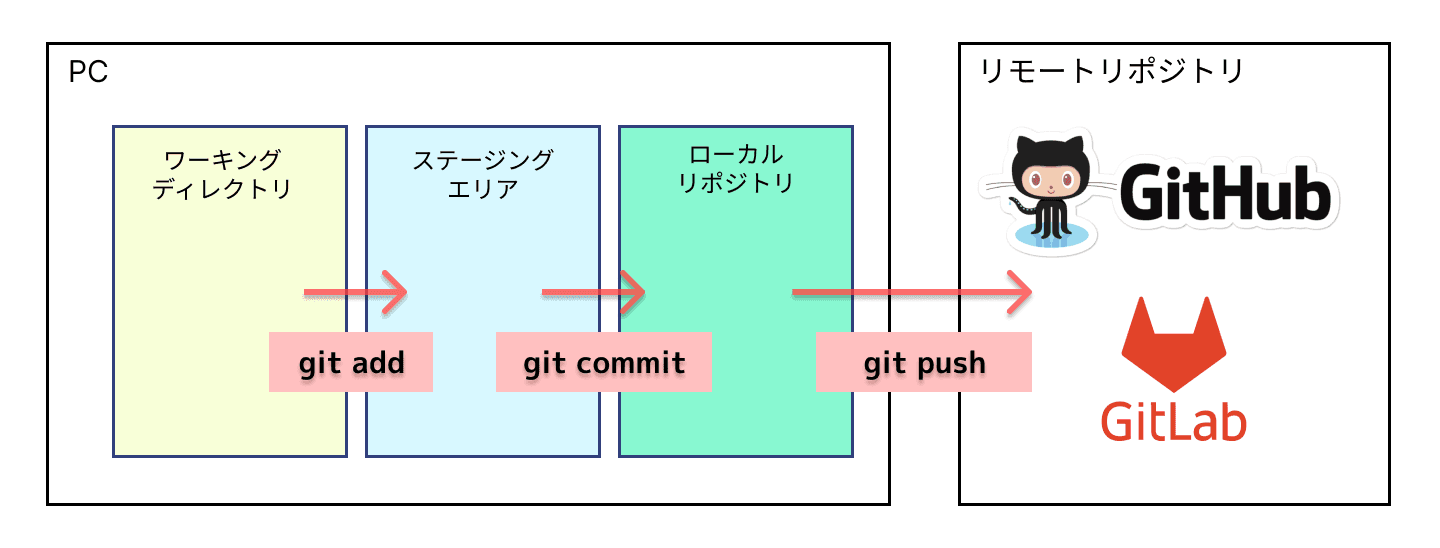 ・ローカルリポジトリ: ステージングエリアに追加された変更をgit commitコマンドでローカルリポジトリに保存します。ローカルリポジトリはあなたのPC上にあり、リモートリポジトリに変更を送信する前にここに保存されます。