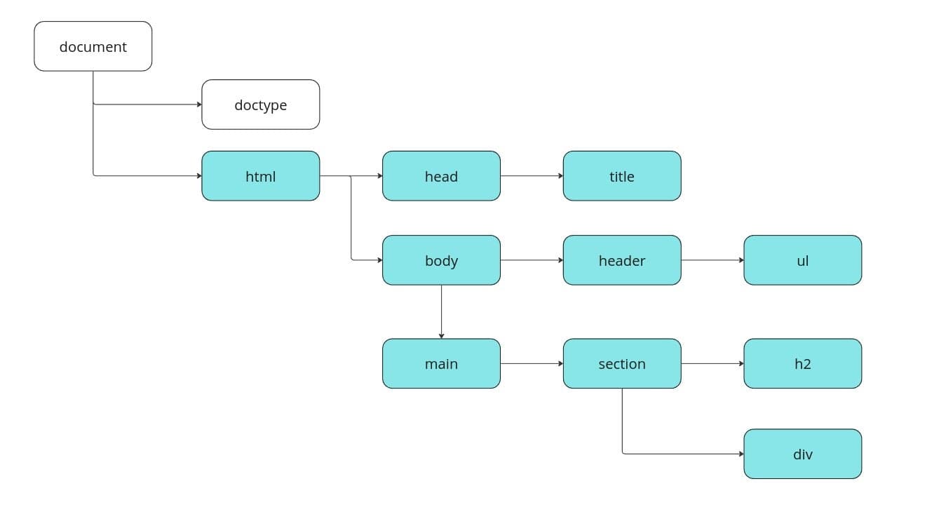 DOMは、ブラウザがHTMLやXMLを解析して生成するデータ構造のことです。「Document Object Model」の略で、組織図のようなツリー構造になっていますね。