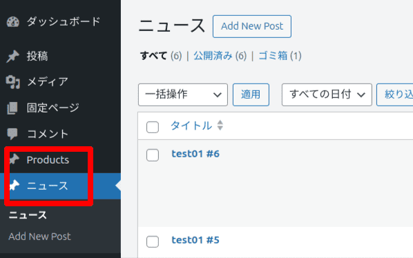 ・NewsとProductの投稿が2つありますね。それぞれに、一覧ページと詳細ページがあります。